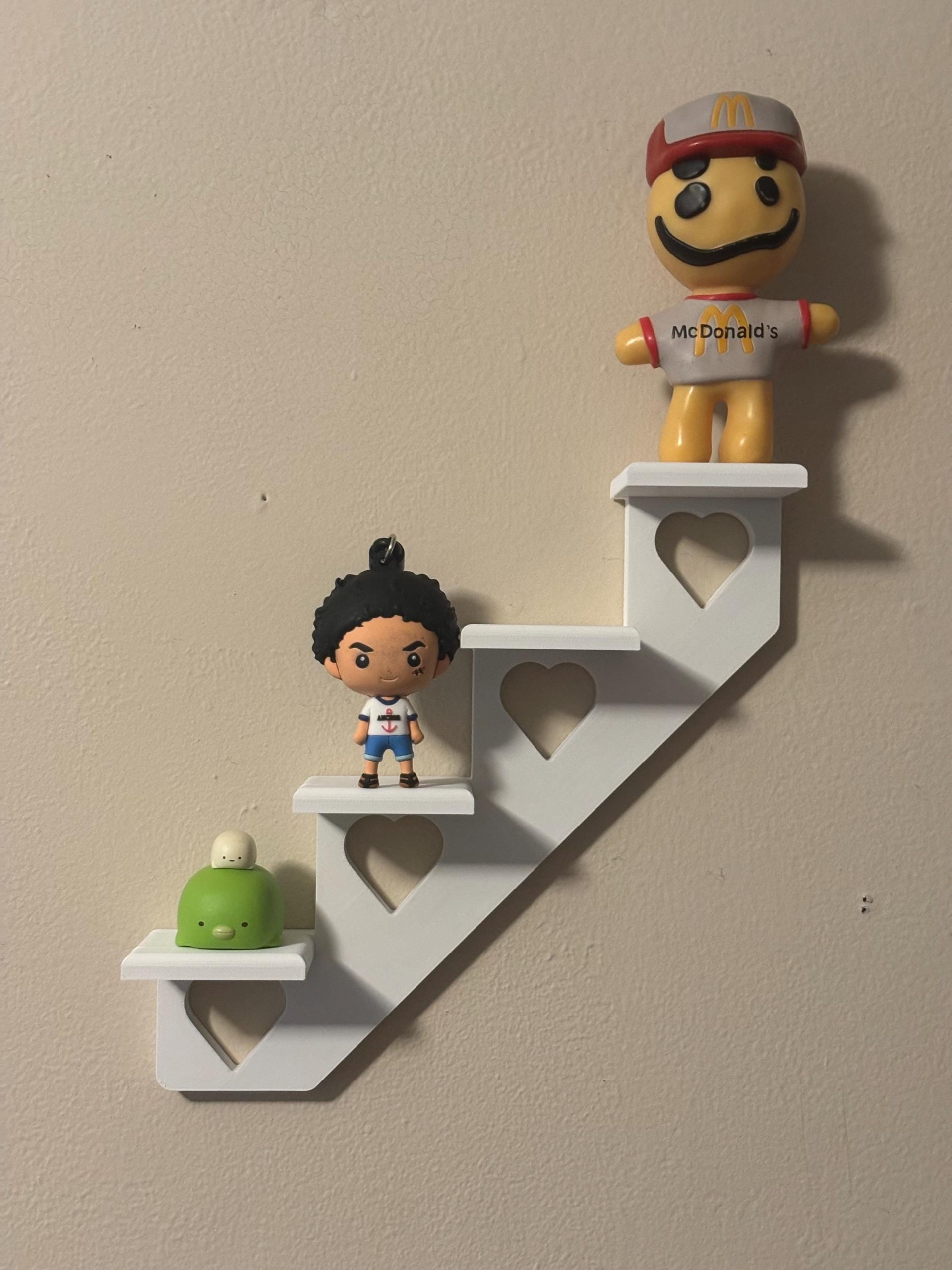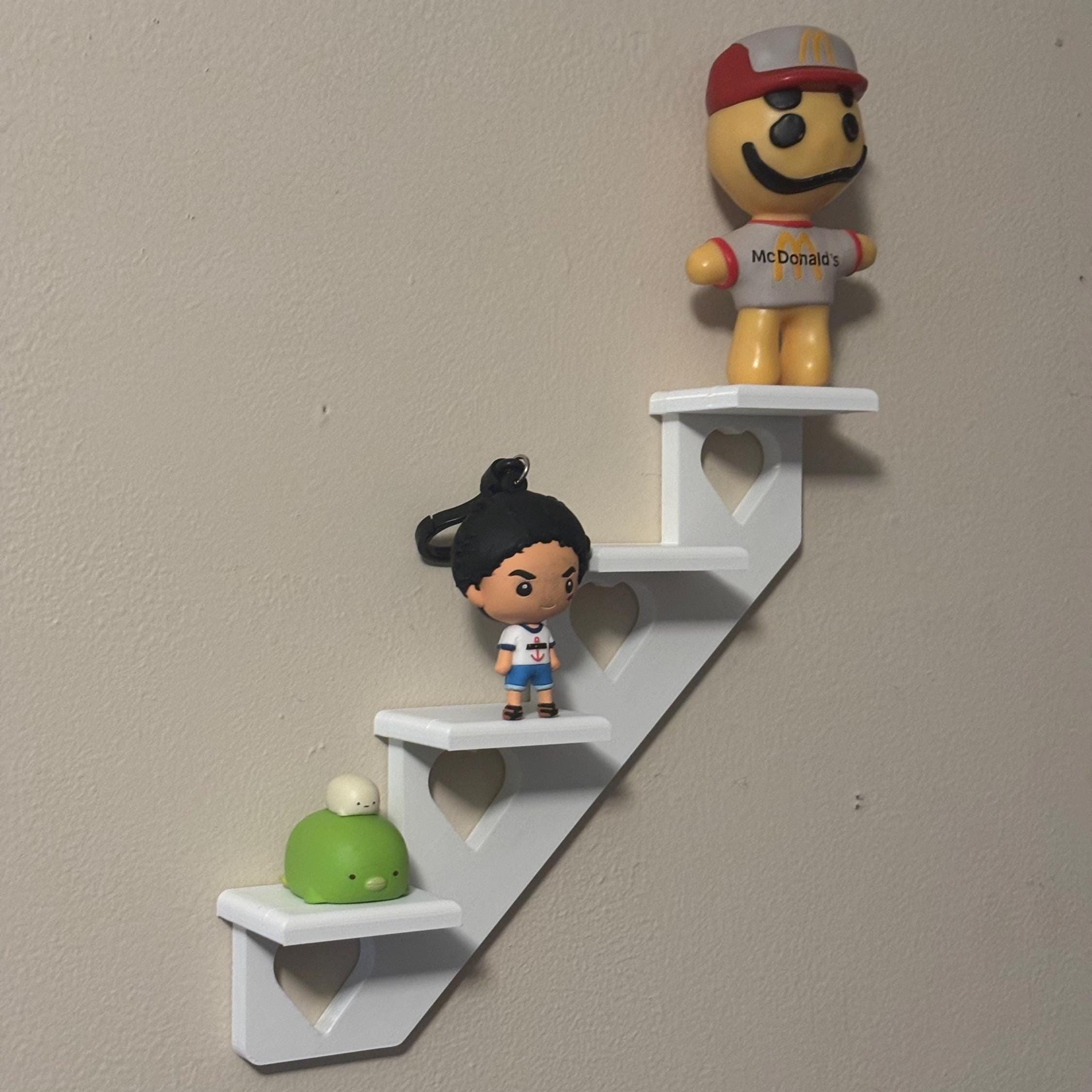 Put your favorite tiny treasures on display with this 4-step diagonal trinket shelf, featuring sweet heart-shaped cutouts under each tier. Its unique slanted staircase design adds a whimsical touch while saving space, perfect for showcasing Smiski, Sonny Angels, or other mini figures/trinkets.