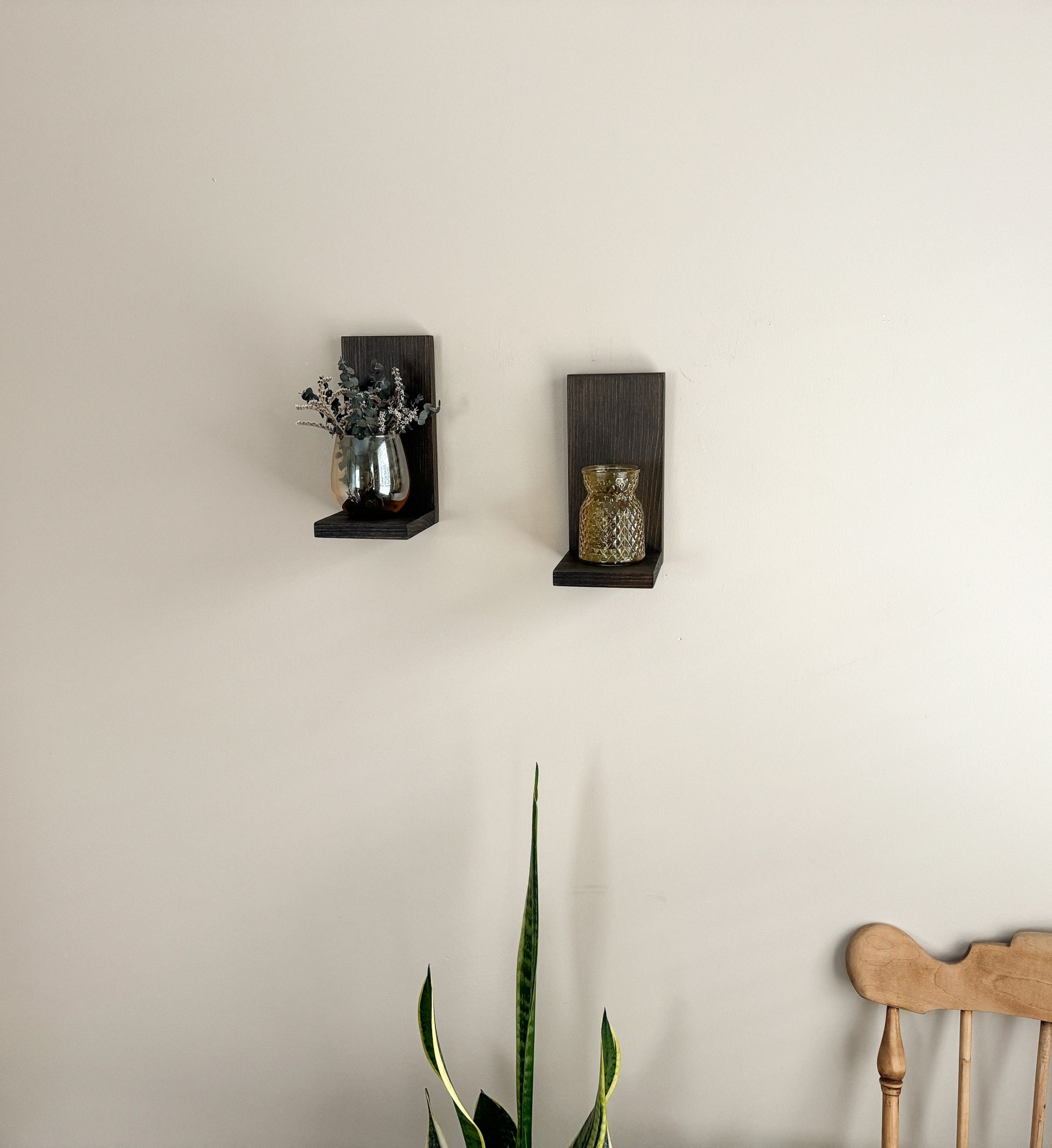 Small wood wall hanging with shelf for plants or decor. Sawtooth hanger on the back (screws/nails not included). Pictured in Early American stain (photos 1-3) and Jacobean stain (video and photos 4-6).
