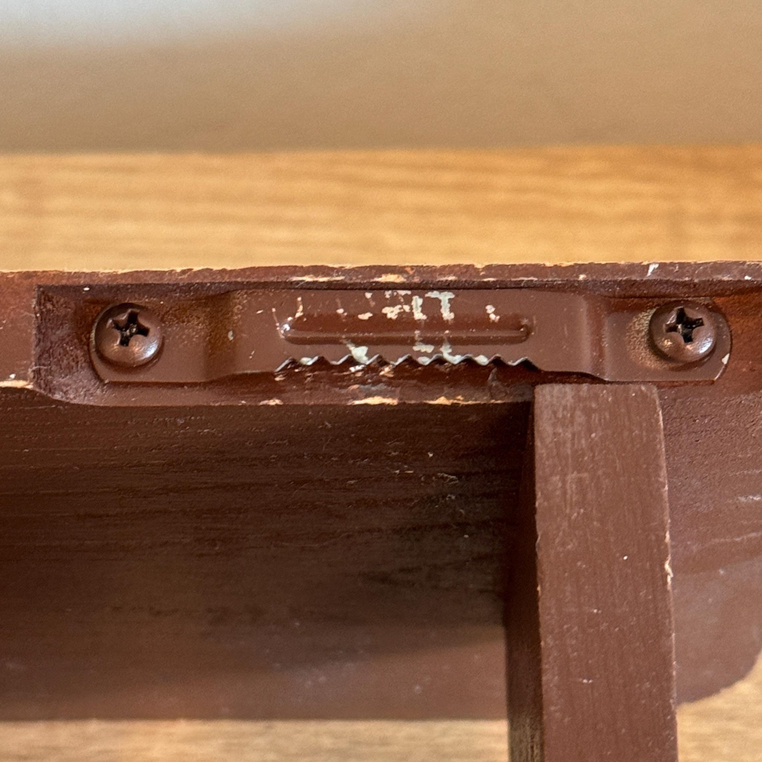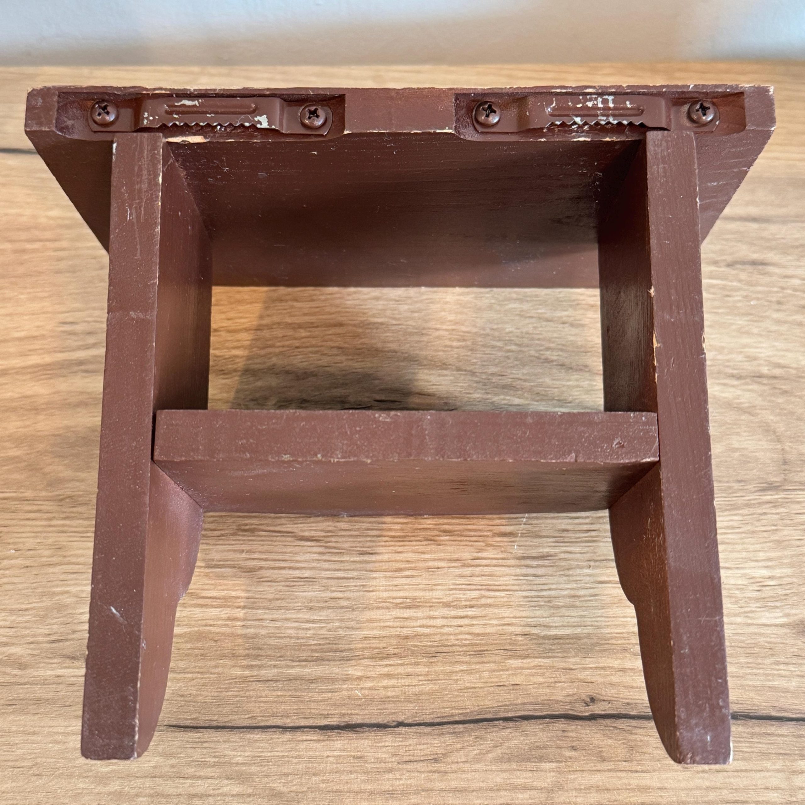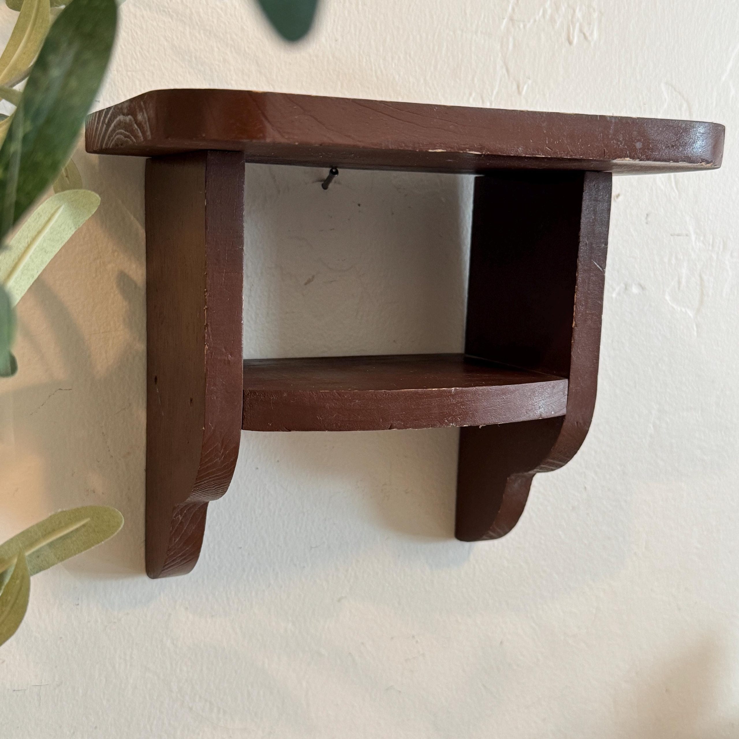Vintage wood shelf with hand cut bracket details and aged patina, solid wooden wall mounted display shelf.